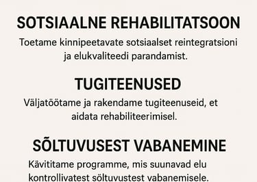 Pakume rehabilitatsiooniteenuseid endistel kinnipeetavatele ja sõltuvustest vabanejatel soovijatel.